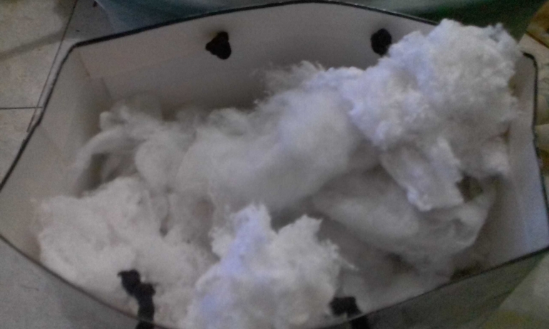 Ratakan dakron lalu jahit tusuk sate supaya awan lebih terbentuk. Jadi ini merupakan kripik yang terbuat dari singkong yang dengan irisan tipis-tipis kemudian saat kering berwarna bening sehingga diberi nama Keripik Kaca. Serat ini jauh lebih kuat dan lebih berkilau dibanding kapas.